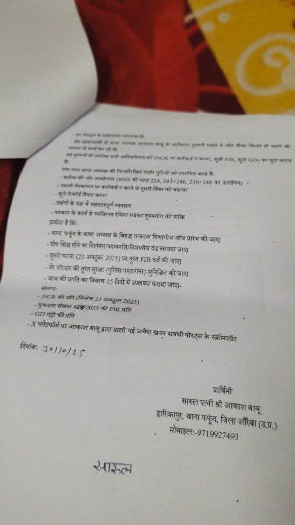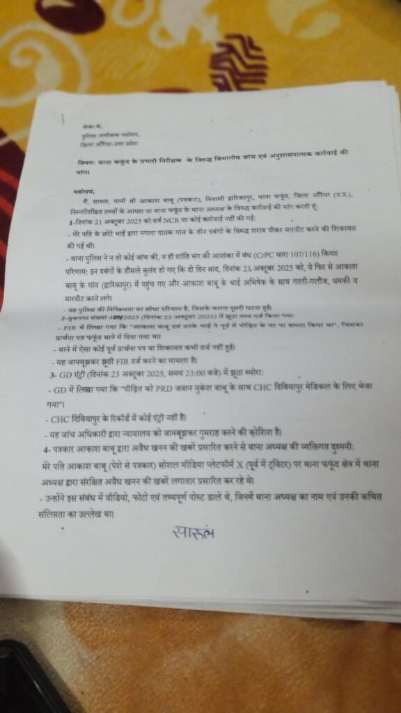 औरैया । यहां के थाना फफूंद क्षेत्र में पुलिस की कथित मिलीभगत से चल रहे अवैध खनन की खबरें सोशल मीडिया पर उजागर करने वाले स्थानीय पत्रकार आकाश बाबू अब खुद पुलिसिया प्रतिशोध का शिकार बन गए। उनकी पत्नी सारुल ने पुलिस अधीक्षक (SP) को एक प्रार्थना पत्र सौंपकर थाना अध्यक्ष पर गंभीर आरोप लगाए – NCR पर जानबूझकर कार्रवाई न करना, झूठी FIR दर्ज करना, फर्जी GD एंट्री बनाना और दबंगों को संरक्षण देकर परिवार को हिंसा के हवाले छोड़ना। पत्र में दावा किया गया , कि थाना अध्यक्ष की व्यक्तिगत दुश्मनी ही इन सबकी जड़ है, क्योंकि आकाश बाबू ने X (पूर्व ट्विटर) पर थाना अध्यक्ष के नाम से अवैध खनन की वीडियो-फोटो वाली पोस्ट्स वायरल की थीं।